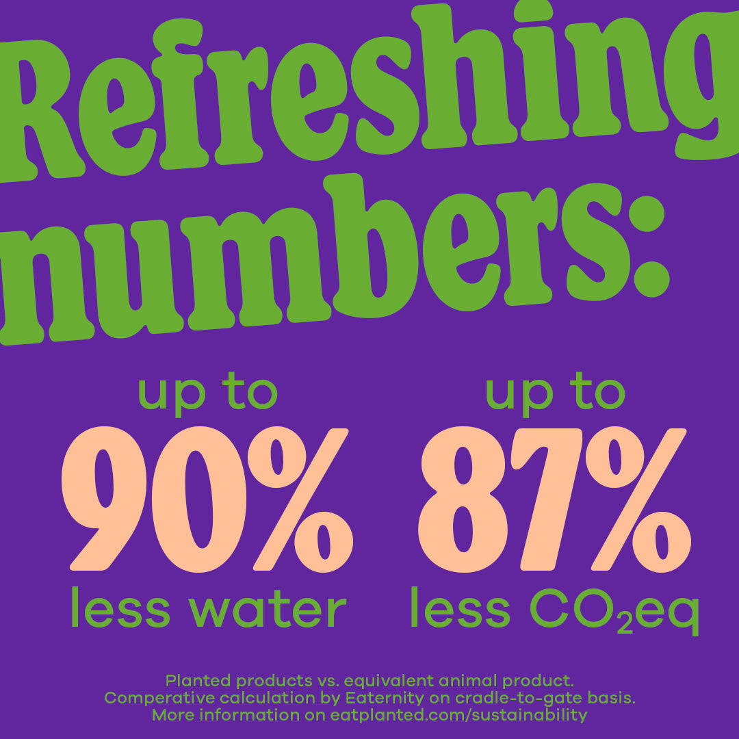 Die Bewertung ergab, dass alle im Einzelhandel erhältlichen pflanzlichen Fleischsorten von Planted im Vergleich zu ihren tierischen Gegenstücken 77-87 % weniger CO2-eq. ausstossen. Die bedeutendsten Reduzierungen ergeben sich aus der Vermeidung von Emissionen aus der Tierhaltung.